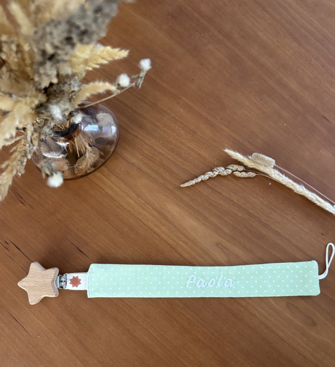Chupetero de tela personalizado, confeccionado a mano con la tela que elijas y el nombre del bebé, para un accesorio único, práctico y lleno de ternura. Ideal para regalar y acompañar a los más pequeños con estilo y cariño desde sus primeros días.