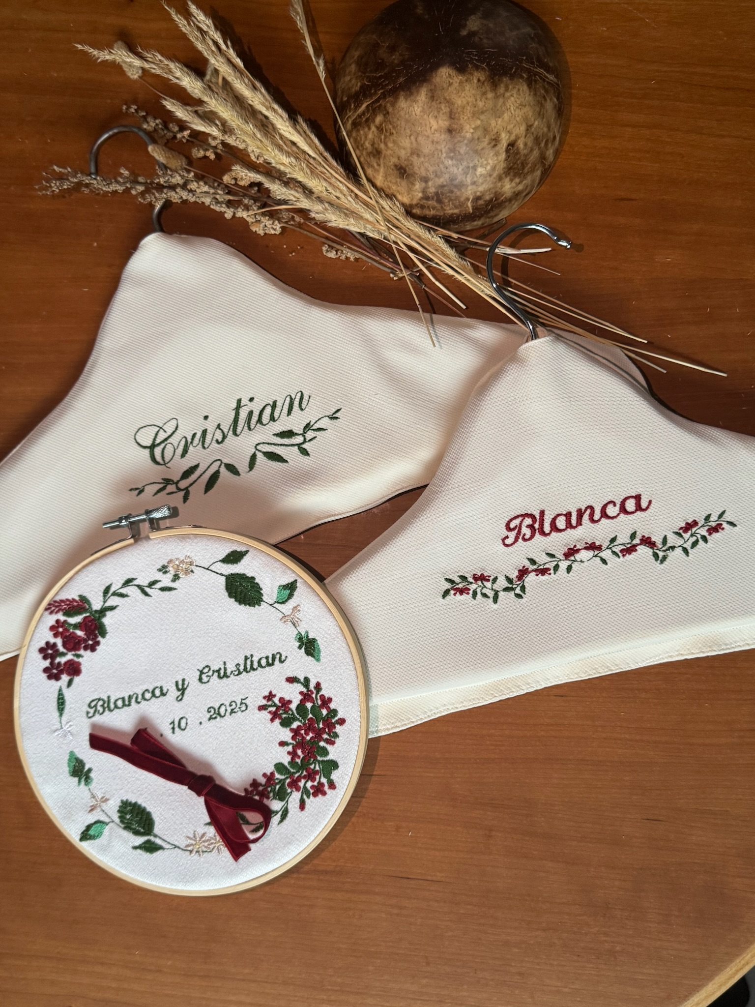 Elige este pack que contiene percha de vestido / traje para el novio y la novia, porta alianzas y cinta de ramo de novia. Porta alianzas personalizado con los nombres de los novios, la fecha y el color que elijas. así como la cinta y las perchas. Todos nuestros productos son hechos a mano. Éste pack es un regalo único para sorprender a una pareja que está a punto de dar el sí quiero.