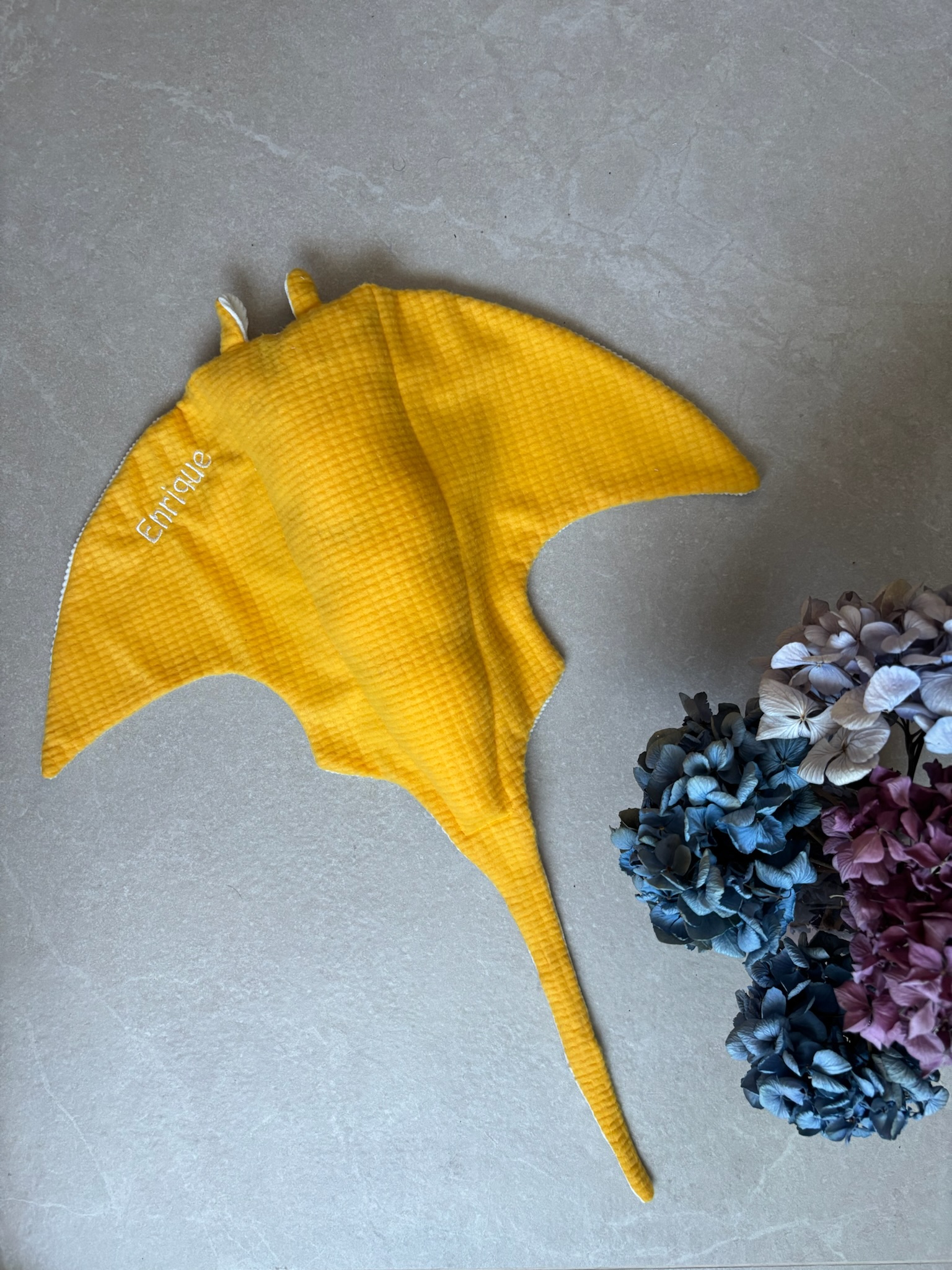 Descubre este adorable peluche de mantarraya, confeccionado y bordado totalmente a mano. Puedes personalizarlo con el nombre del niño o niña para convertirlo en un regalo único y muy especial. Un detalle perfecto.